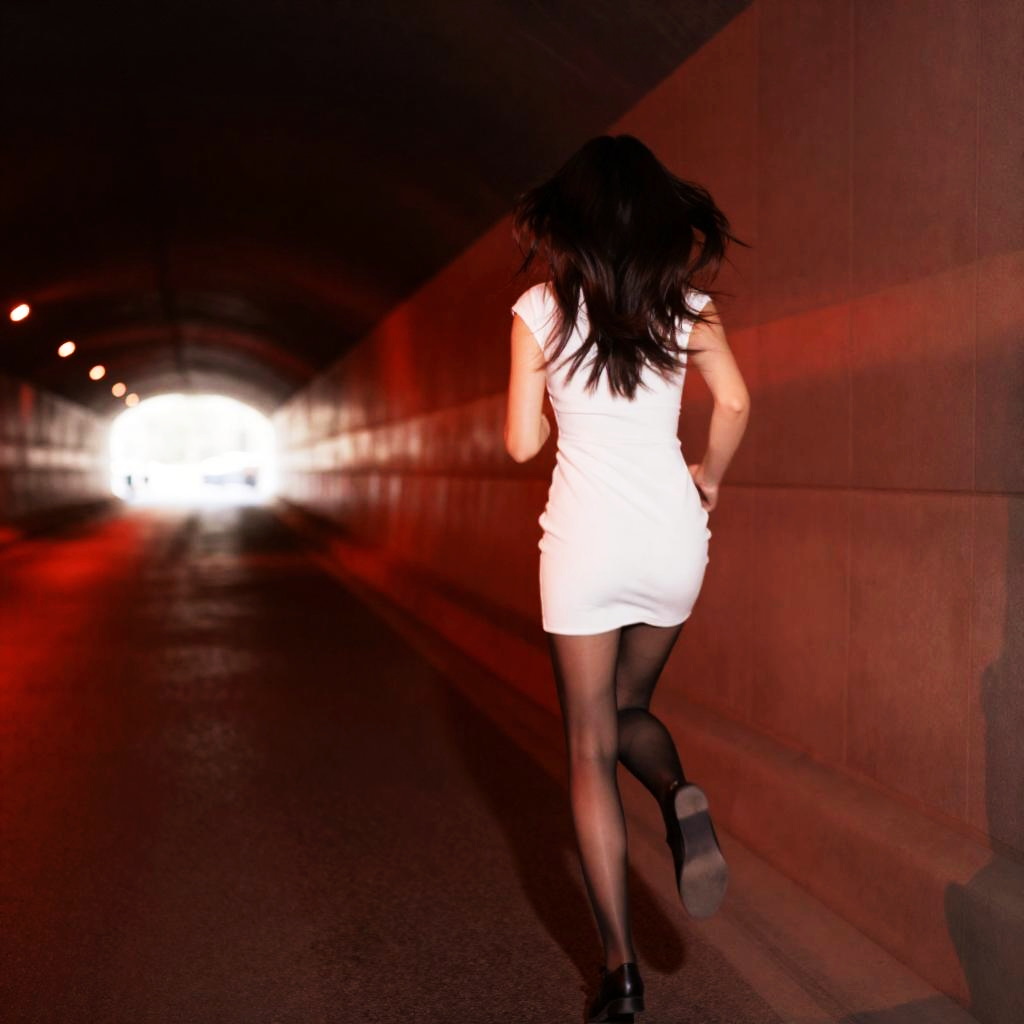 Photograph of a woman running down a red-lit tunnel. She has a slender build, wearing a white dress with black stockings and black shoes. Her back is to the camera, blurred in motion. The tunnel has wooden panels and a glowing light at the end. The floor is dark and slightly wet.