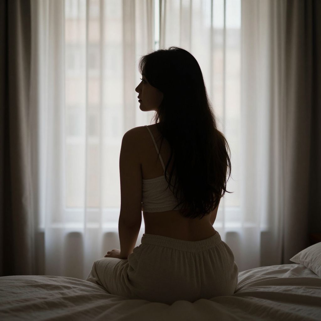 Silhouetted woman sitting on a bed, gazing out through sheer curtains at a softly lit window, her long hair cascading over her shoulders as sunlight filters through the room.