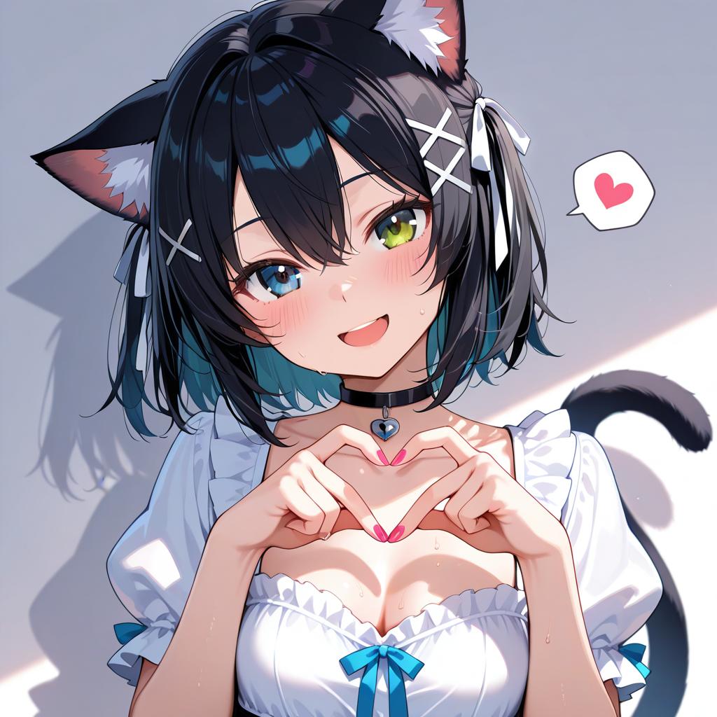 1girl, sensitive, masterpiece, newest, absurdres, best quality, :d, animal ear fluff, animal ears, black hair, blue eyes, blush, breasts, cat ears, cat girl, cat tail, choker, cleavage, collarbone, dress, expressionless, fang, fingernails, frilled shirt collar, frills, hair between eyes, hair ornament, hair ribbon, hairclip, happy, head tilt, heart, heart hands, holding, holding hair, looking at viewer, nail polish, open mouth, puffy short sleeves, puffy sleeves, ribbon, shadow, short sleeves, small breasts, smile, solo, spoken heart, sweat, tail, teeth, upper body, upper teeth only, white dress, x hair ornament, yellow eyes