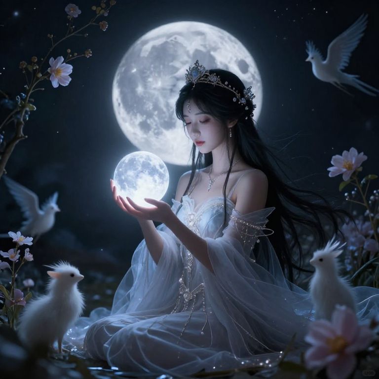 Photorealistic digital art: Elven woman with long white hair, pointed ears, and ethereal white dress, gently holds glowing star in moonlit