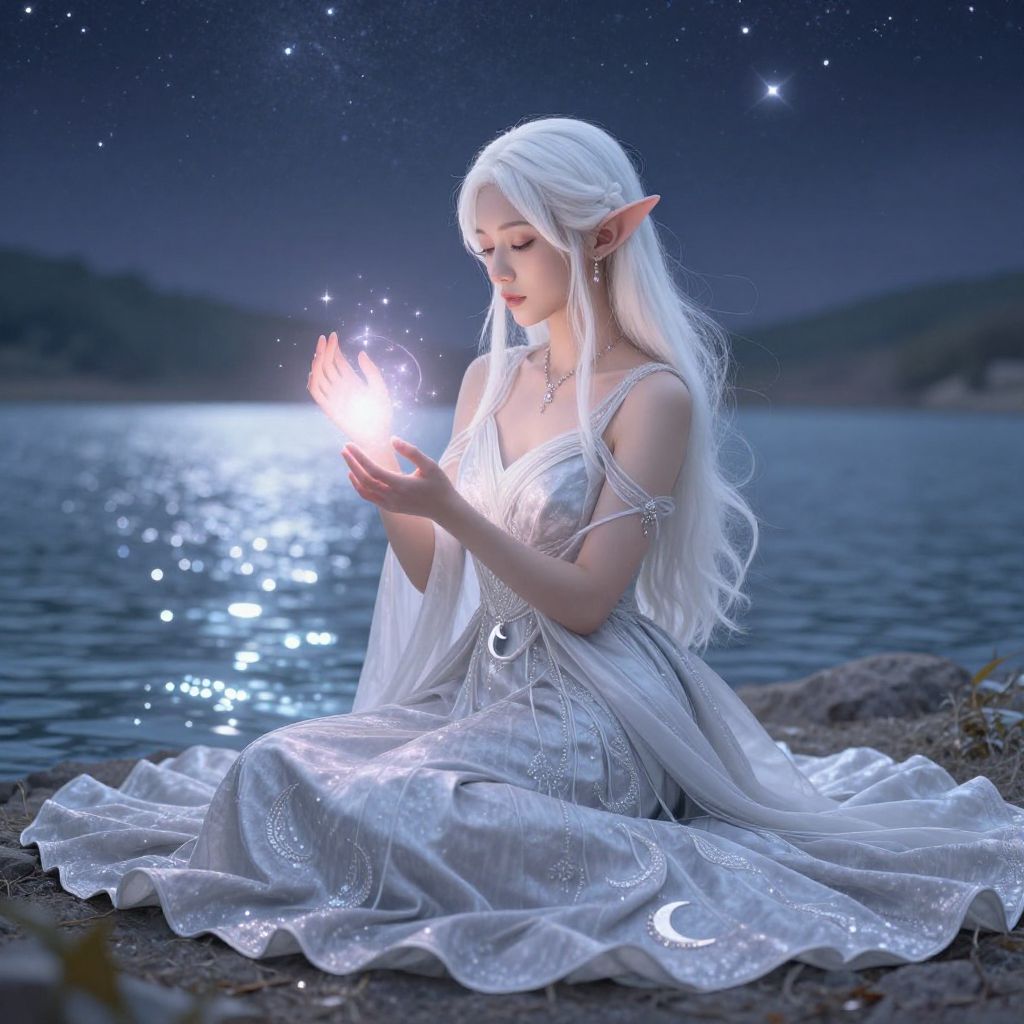 Elegant elf with white hair sitting by a shimmering lake under a star-filled sky, wearing a flowing silver gown adorned with moon motifs, gentle magical aura radiating from hands, dreamy fantasy environment with soft colors
