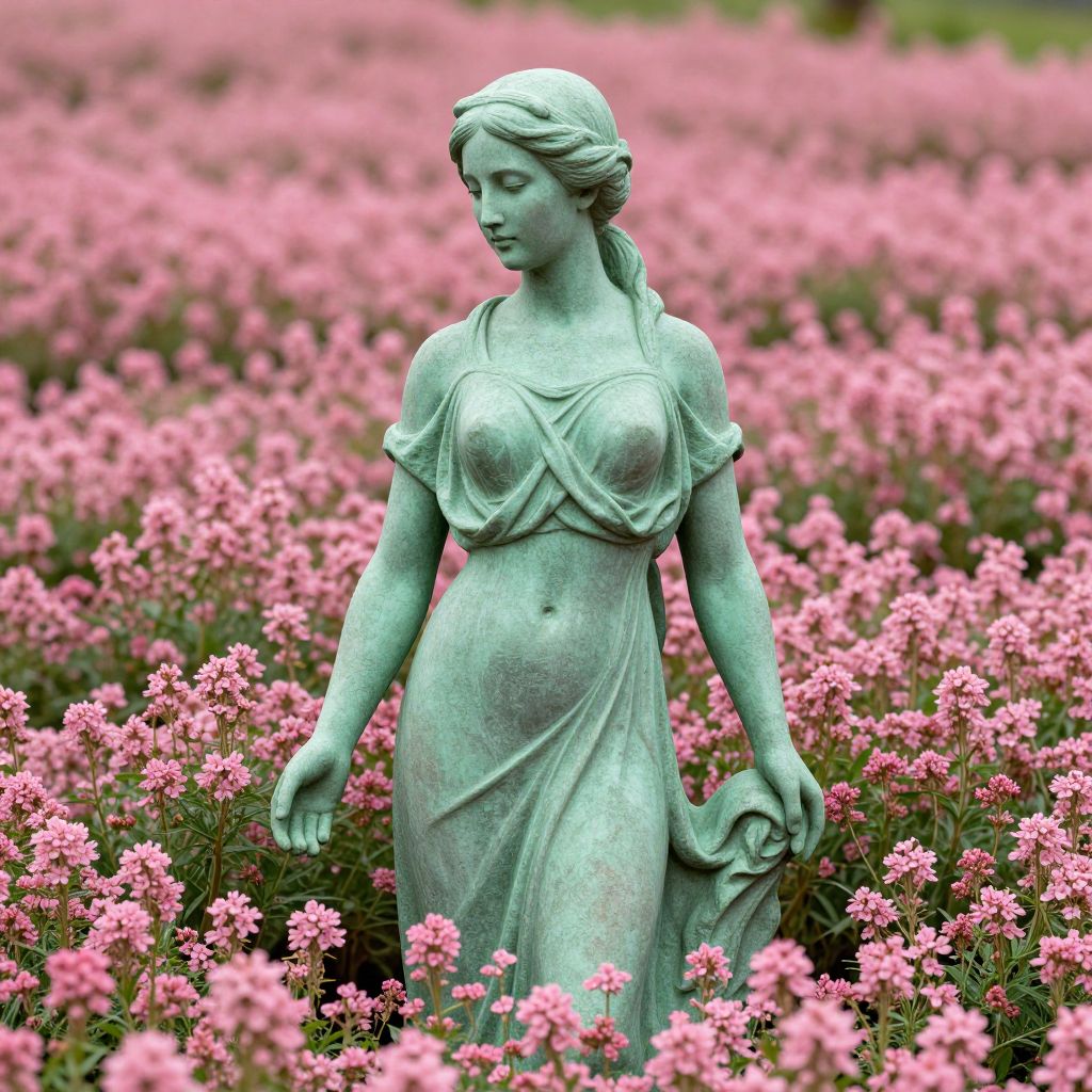 A verdant statue of a woman, etched with subtle patina, stands serenely amidst a field of vibrant pink flowers that seem to emerge directly from her form, defying the boundaries between stone and life.
