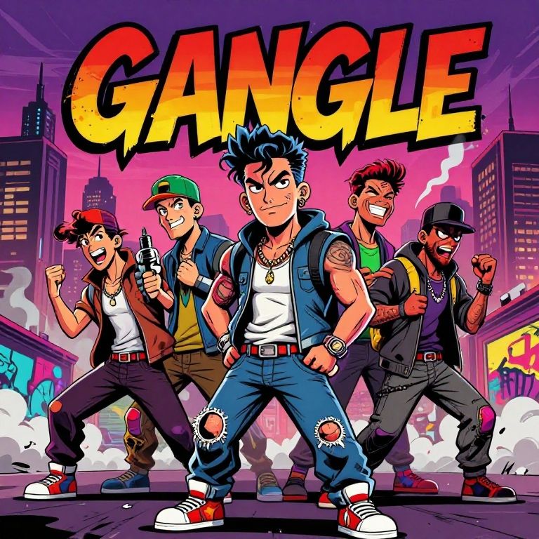 Gangle pictured in a stylized comic book cover style, bold outlines and vibrant colors, exaggerated features capturing rebellious attitude, urban skyline in the background, smoky effects and graffiti, dynamic action poses highlighting group unity