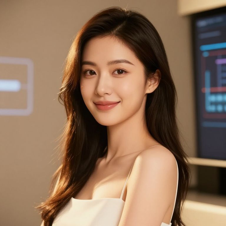 Actress ai prompt latest: A high-resolution portrait of an AI-created actress in a modern studio setting, softly lit with warm golden rays, posing with a subtle smile, background features abstract digital patterns and AI-generated textures, realistic skin and eye details, photorealistic style.
