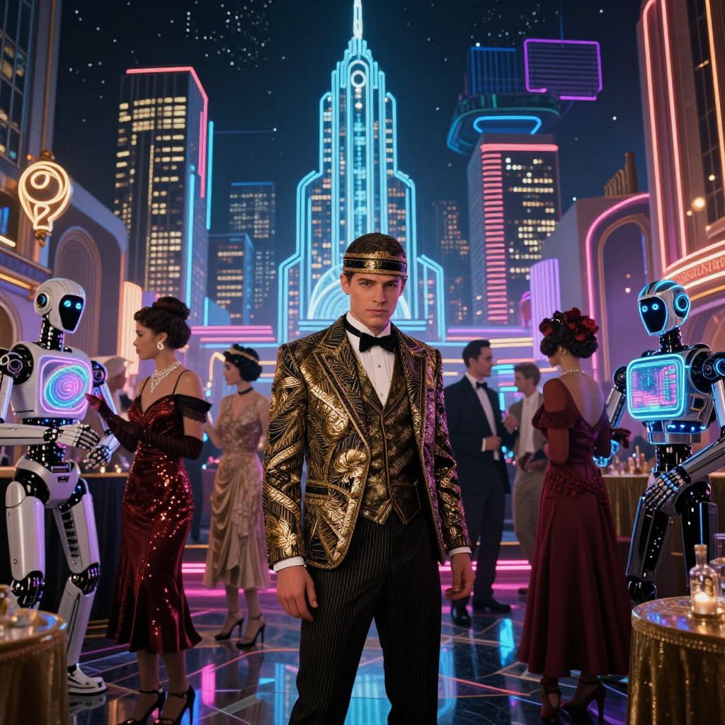 Neon-lit retro ballroom with a handsome man in a gold sequin tux, surrounded by elegantly dressed women, robots, and futuristic