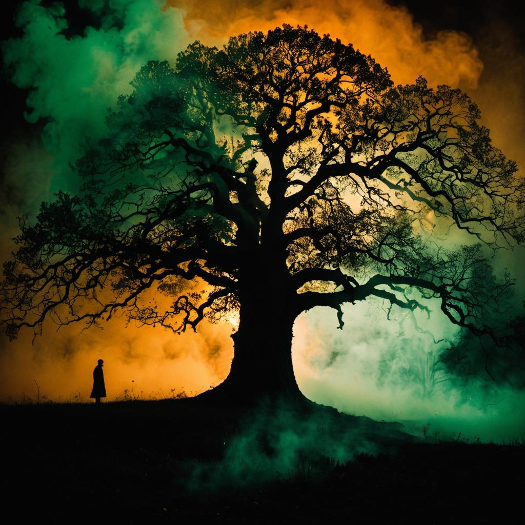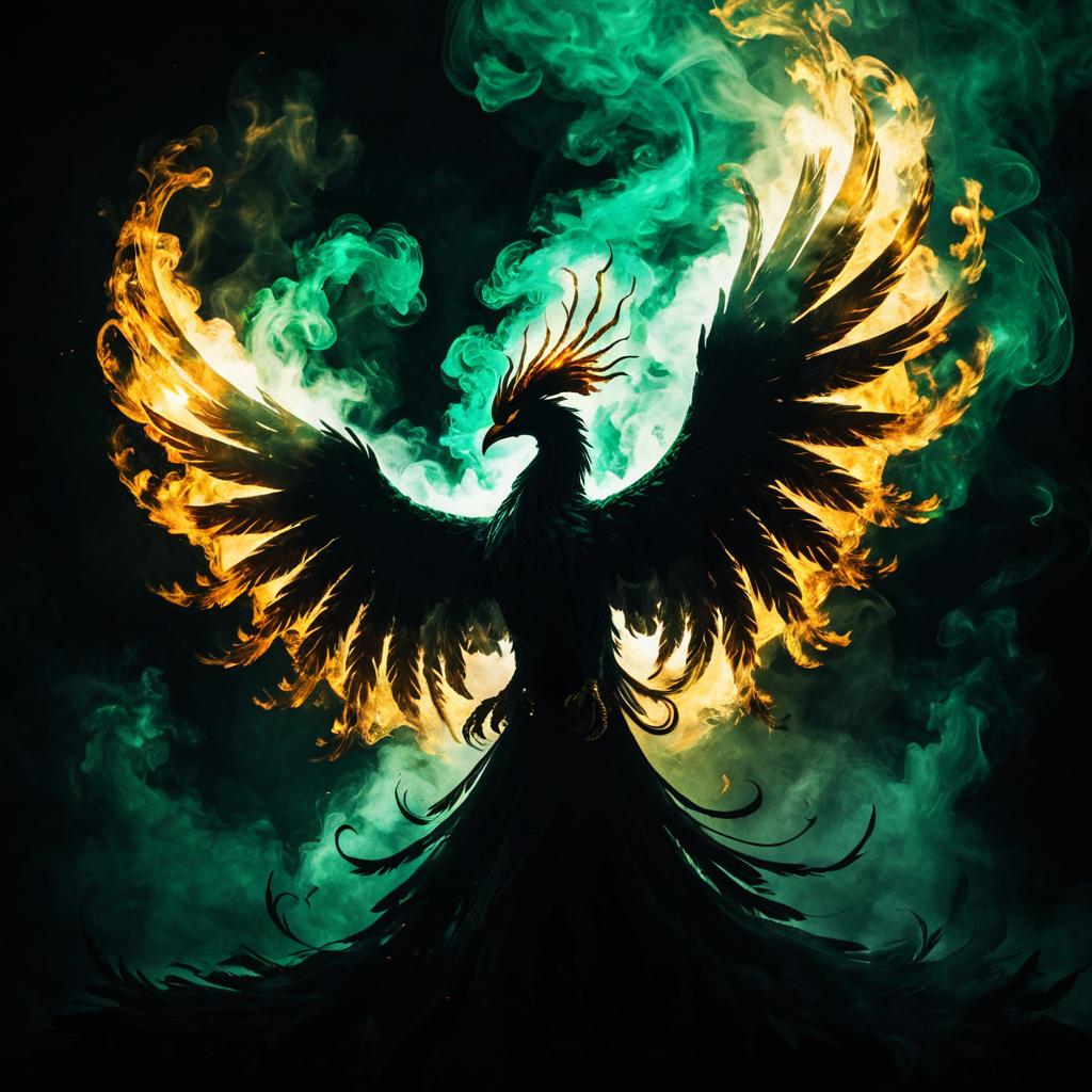 Ethereal phoenix silhouette, surrounded by glowing amber and emerald smoke, abstract ethereal effect, smoky textures swirling around the figure, golden rim lighting, dark background for contrast, surreal and mysterious atmosphere
