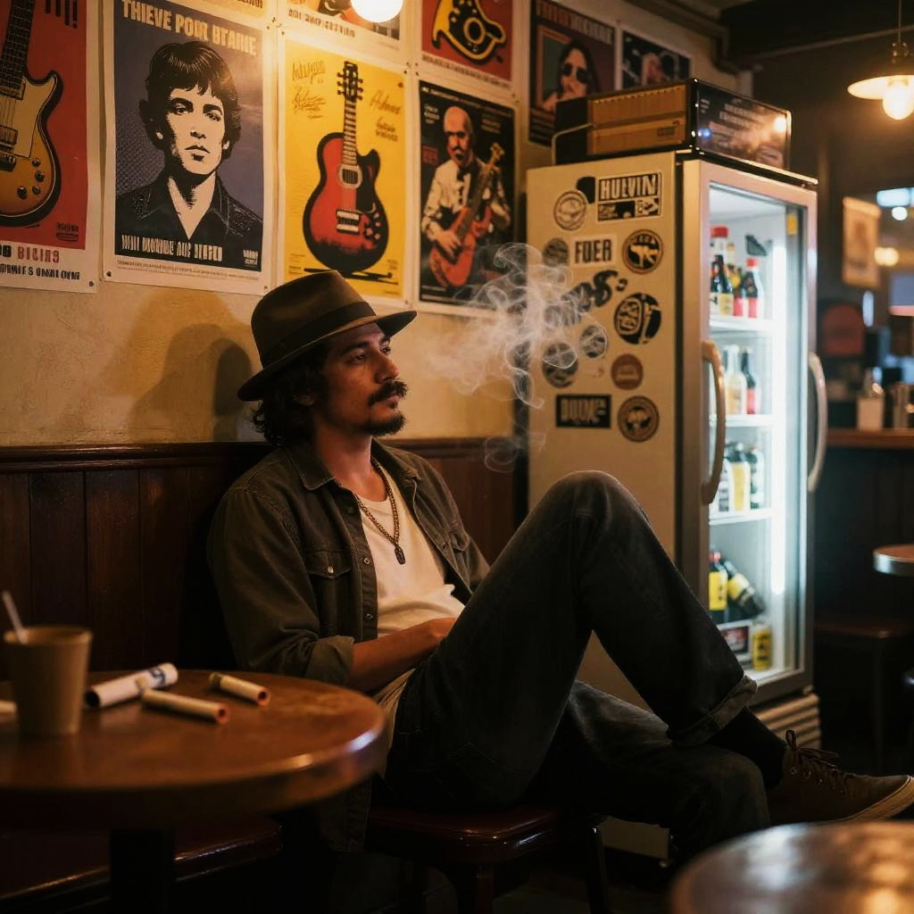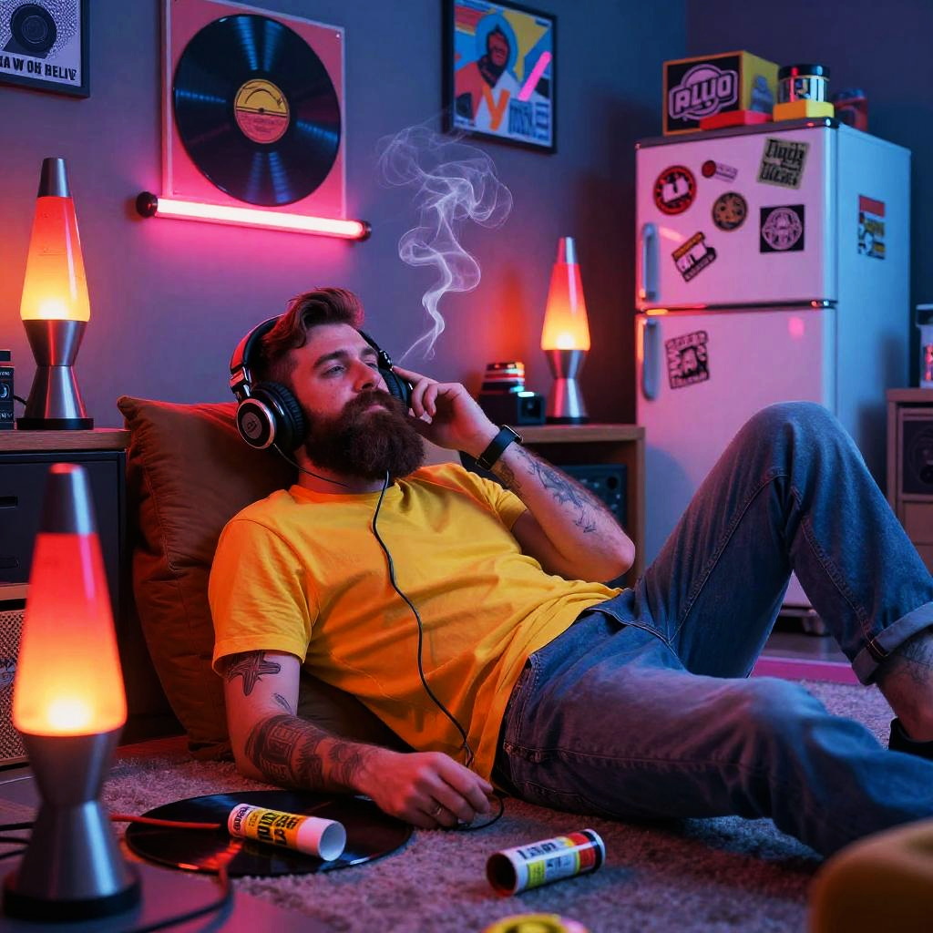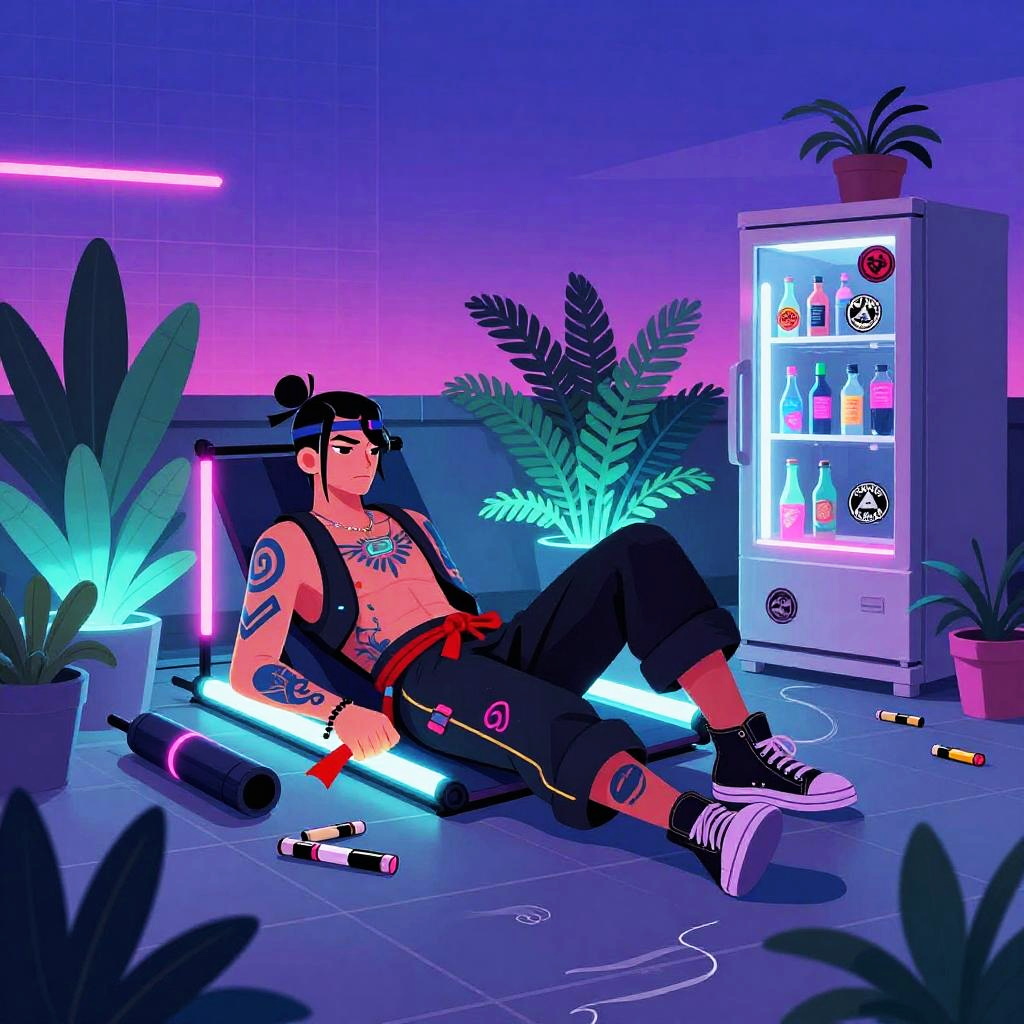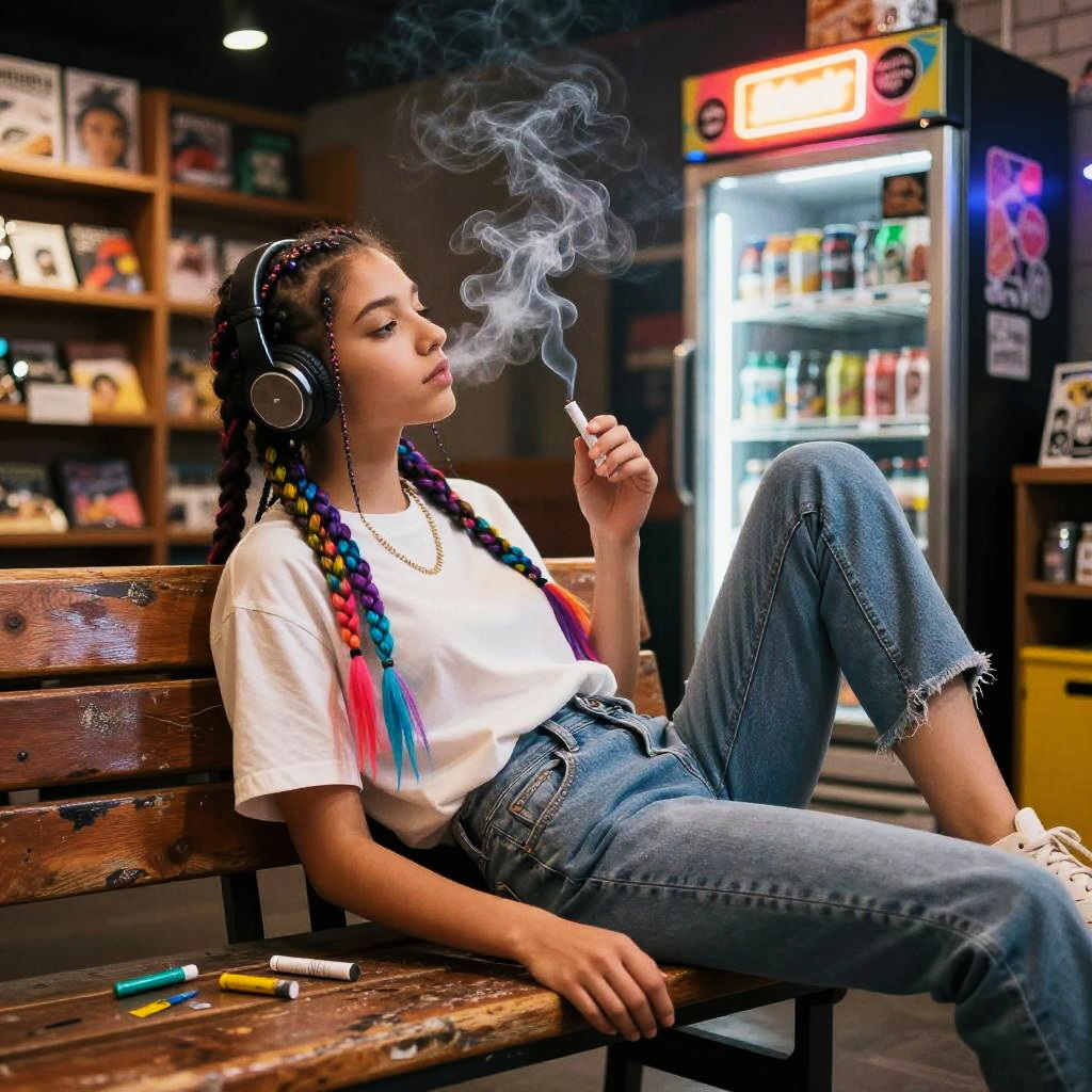Carefree boombox dancer in bright streetwear lounging on a cracked concrete bench under flickering street lamps, joints and rolling papers scattered, hazy smoke ribbons, neon tube glow, sticker-bombed fridge, bold color blocks and duotone accents, bold pop art style with thick outlines and energetic duotones, low angle, cinematic rim light, soft haze, urban chill atmosphere, high microdetail, crisp linework, balanced composition