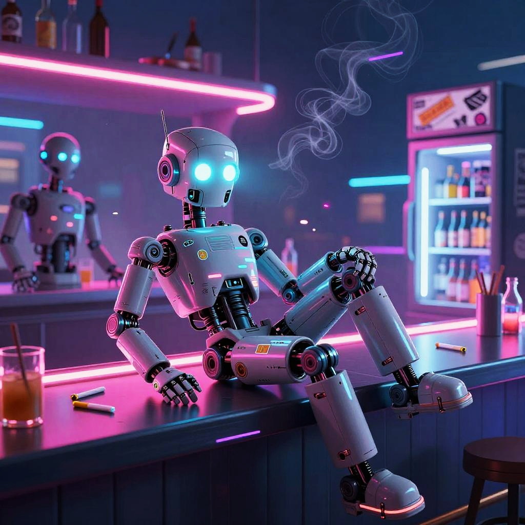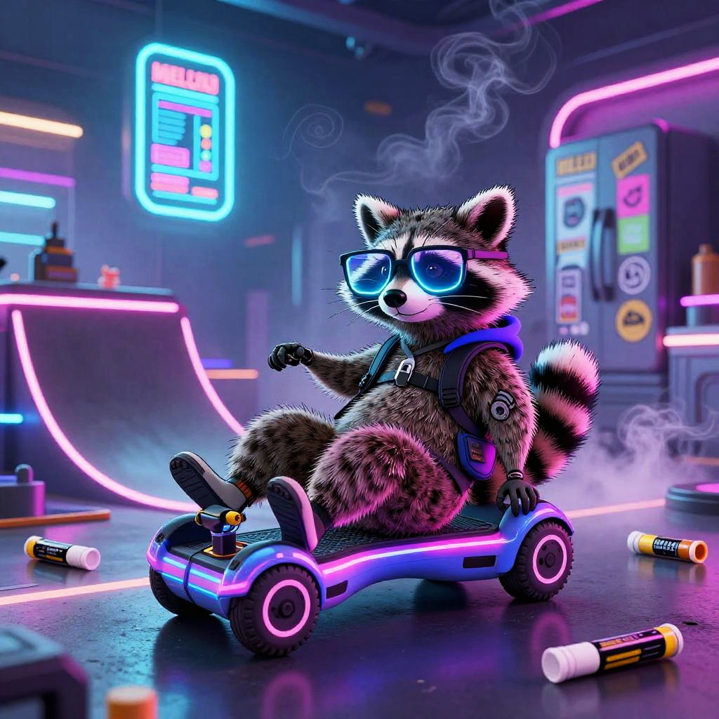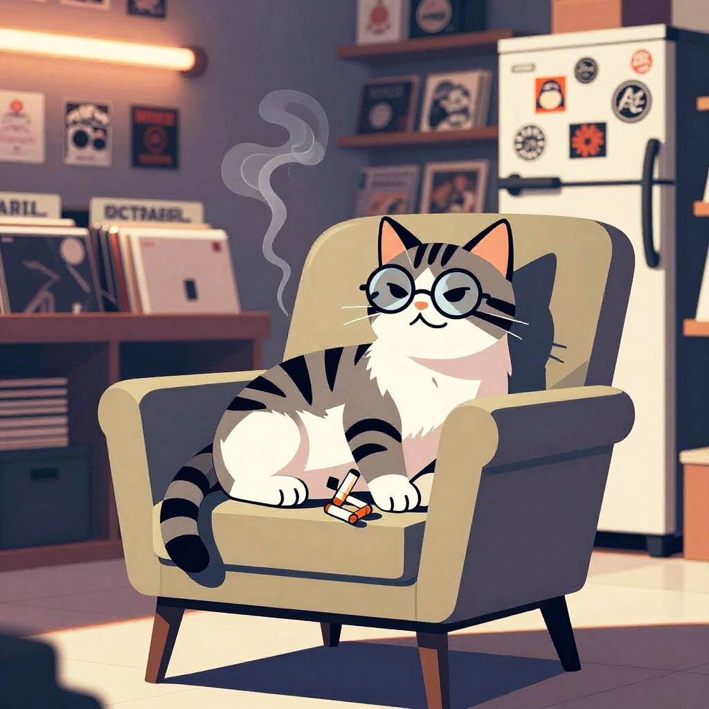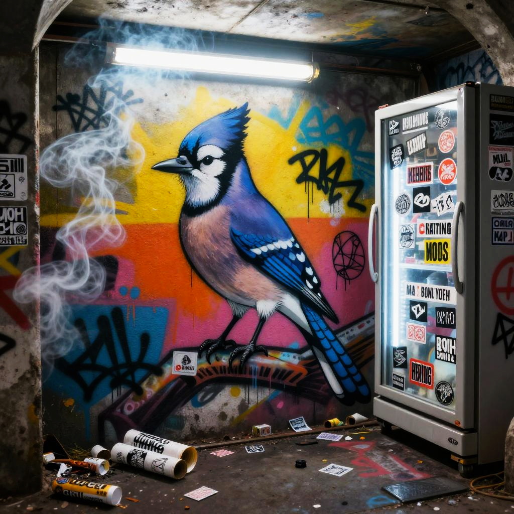 Carefree boombox dancer in bright streetwear lounging on a cracked concrete bench under flickering street lamps, joints and rolling papers scattered, hazy smoke ribbons, neon tube glow, sticker-bombed fridge, bold color blocks and duotone accents, bold pop art style with thick outlines and energetic duotones, low angle, cinematic rim light, soft haze, urban chill atmosphere, high microdetail, crisp linework, balanced composition