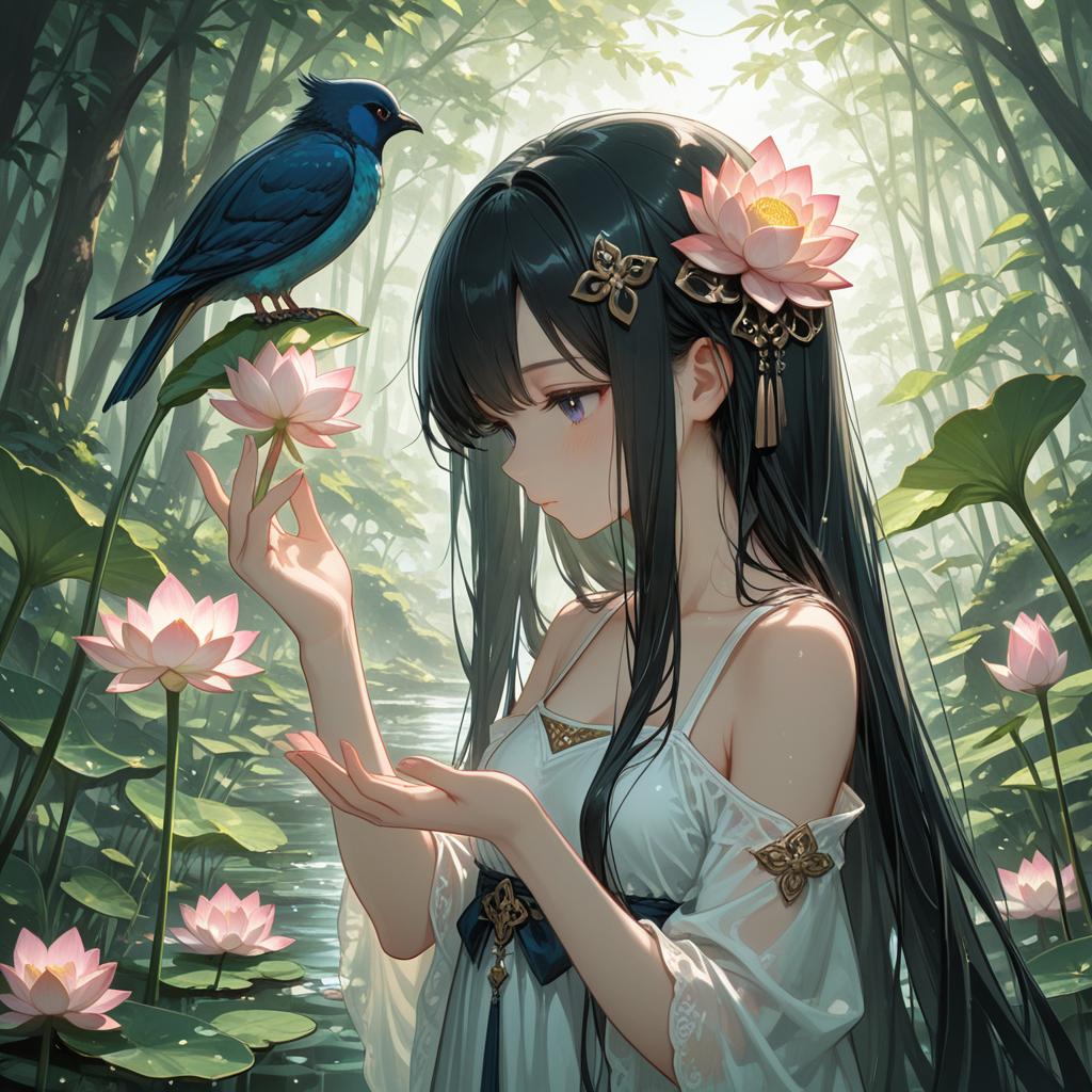 Masterpiece, (masterpiece, top quality, best quality), 1girl, long hair, bird, flower, black hair, lotus, solo, hair ornament, dress, bare shoulders, very long hair, upper body