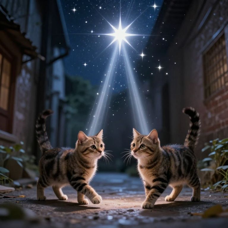 Two tabby cats stride through a cosmic alleyway, their forms illuminated by a radiant starburst above, as they playfully chase beams of celestial light that streak across the night sky.