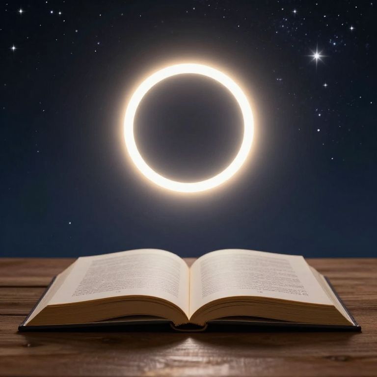Open book rests on a wooden surface beneath a mesmerizing night sky, illuminated by a glowing circular halo resembling an eclipse, surrounded by twinkling stars.