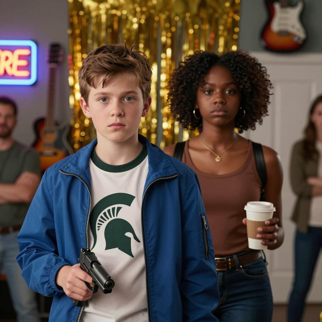 A boy with brown hair, wearing a blue jacket and white "Michigan State" shirt, holds a gun in the foreground. A black girl with curly hair, wearing a brown top, stands behind him. They are in a room with gold tinsel, neon signs, and guitar decorations. The boy looks determined, while the girl looks serious. A cup with a lid is in the boy's right hand. Two people total. The background includes illuminated signs and a door. The visual style is a photograph.