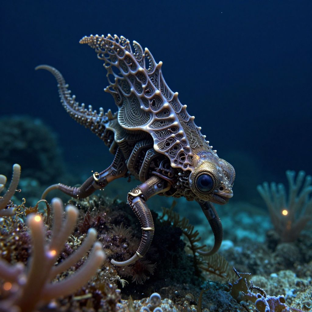 A surreal aquatic scene featuring a cryptic marine life form with an elaborate, biomechanical exoskeleton blending organic and metallic textures. The creature glides gracefully through deep ocean waters illuminated by soft bioluminescent flora, creating an ethereal underwater atmosphere reminiscent of a sci-fi marine environment.