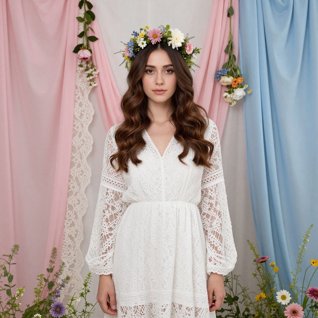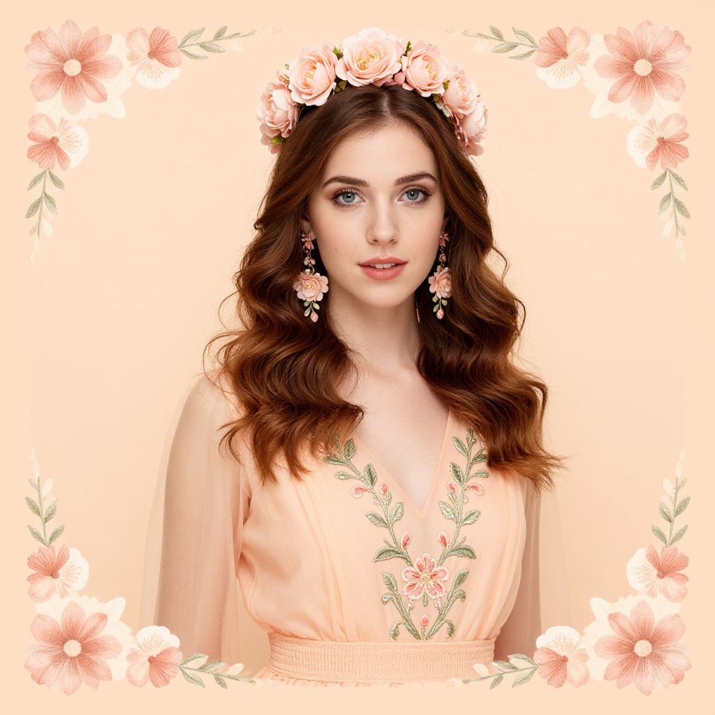 Portrait of a young woman with wavy brown hair wearing a peach-colored floral embroidered dress and matching flower crown. She is also wearing long floral earrings and posing against a peach background decorated with a matching floral frame.