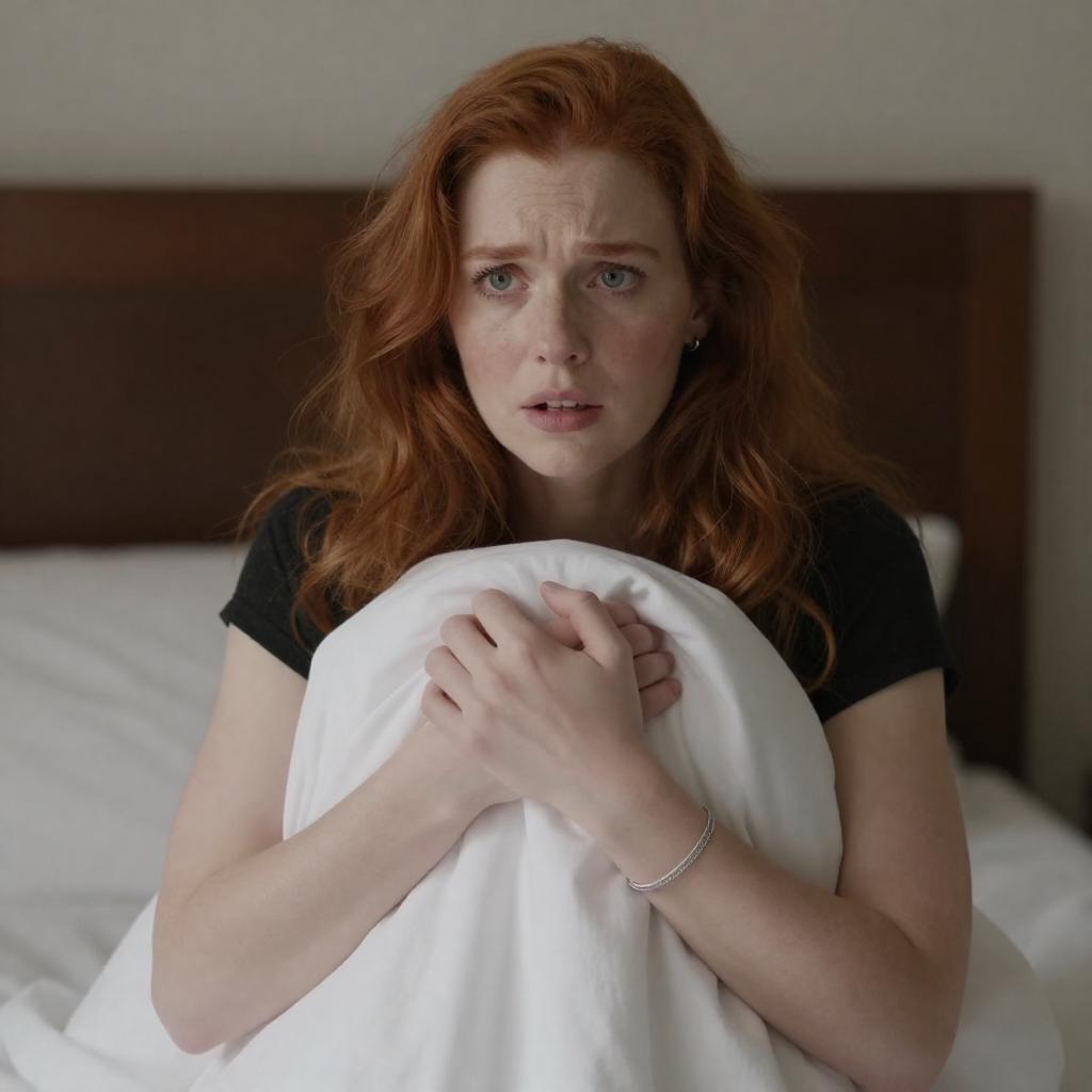 Photograph of a red-haired woman with curly hair, wearing a white top, resting her head on the table with a sad expression. A person with a pink hairnet and brown top hugs her from behind. Background: blurred wall and objects. Foreground: two dark bottles and green package.