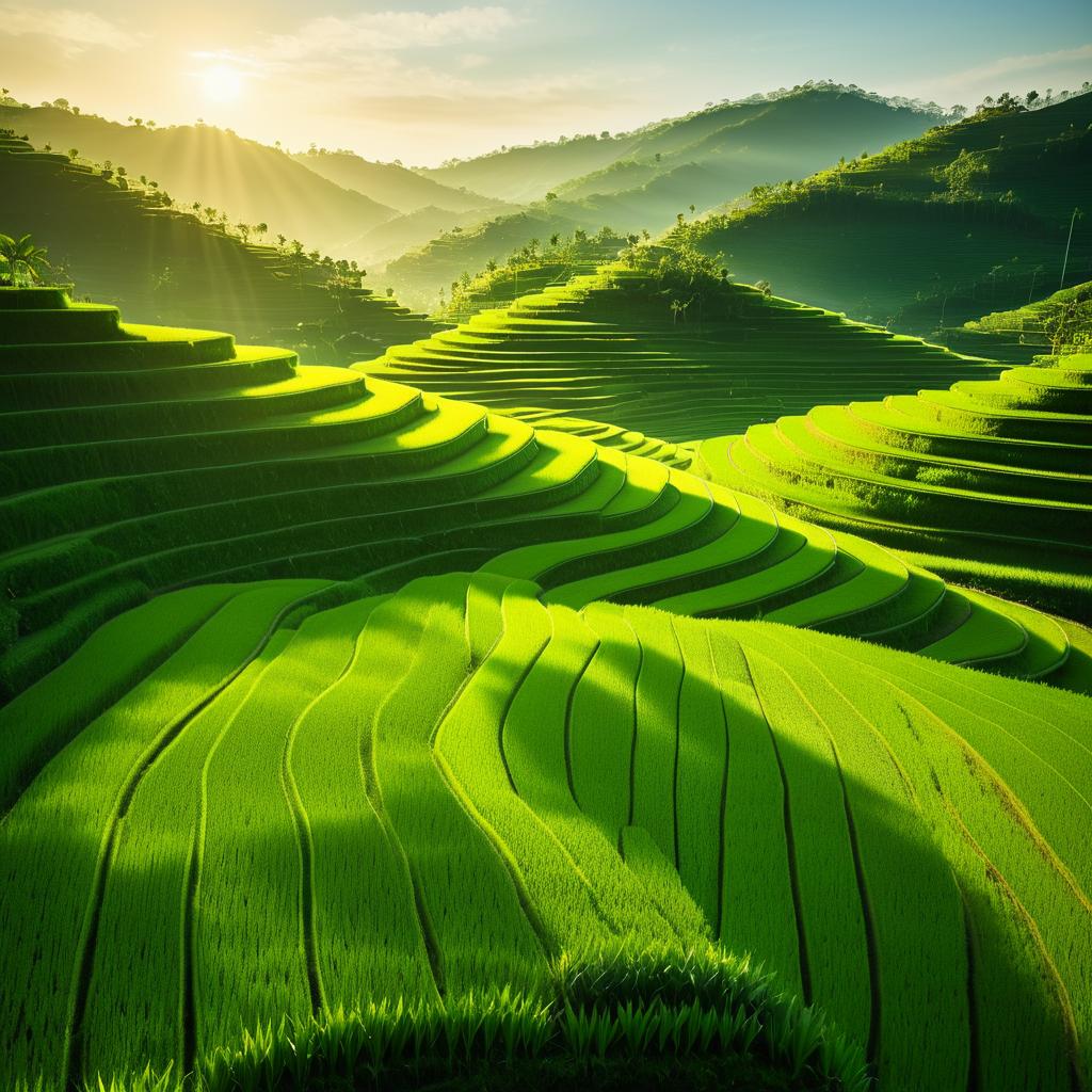 Lush green rice terraces, golden hour lighting casting long shadows, extra wide angle field of view, infinity vanishing point