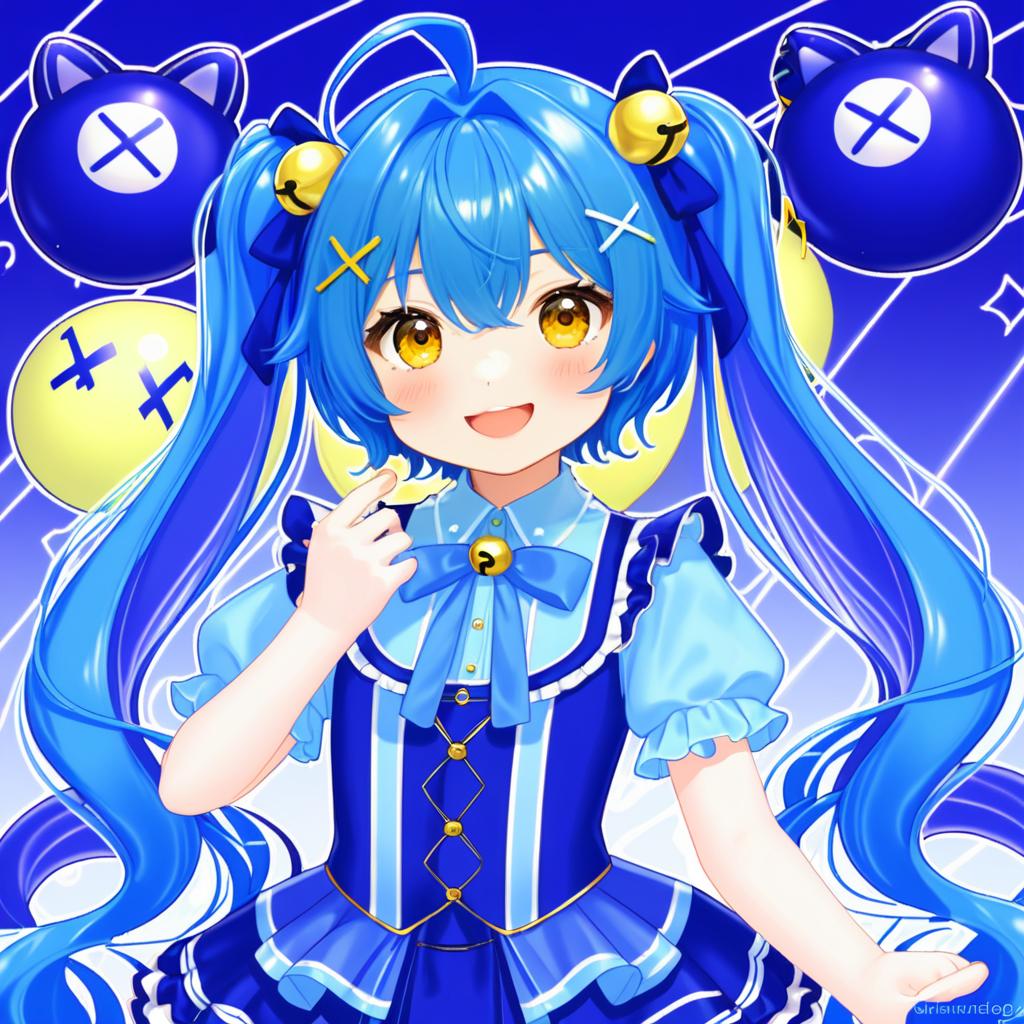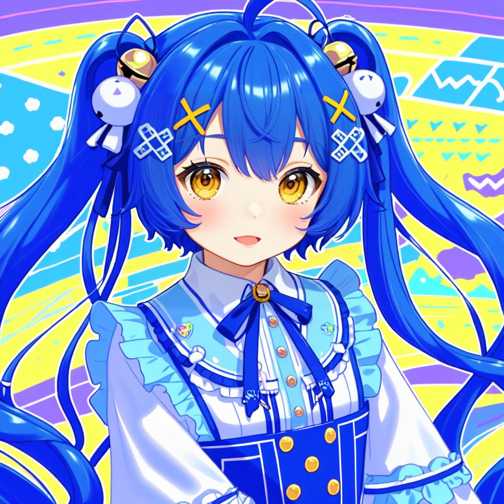 Digital illustration of a virtual youtuber character featuring bright blue twintails with hair bells and ribbons, yellow eyes, and distinctive x-shaped hair ornaments. The character wears a detailed blue and white outfit with gold buttons and frills, exuding an anime-inspired aesthetic. The background is colorful with abstract yellow, purple, and blue patterns.