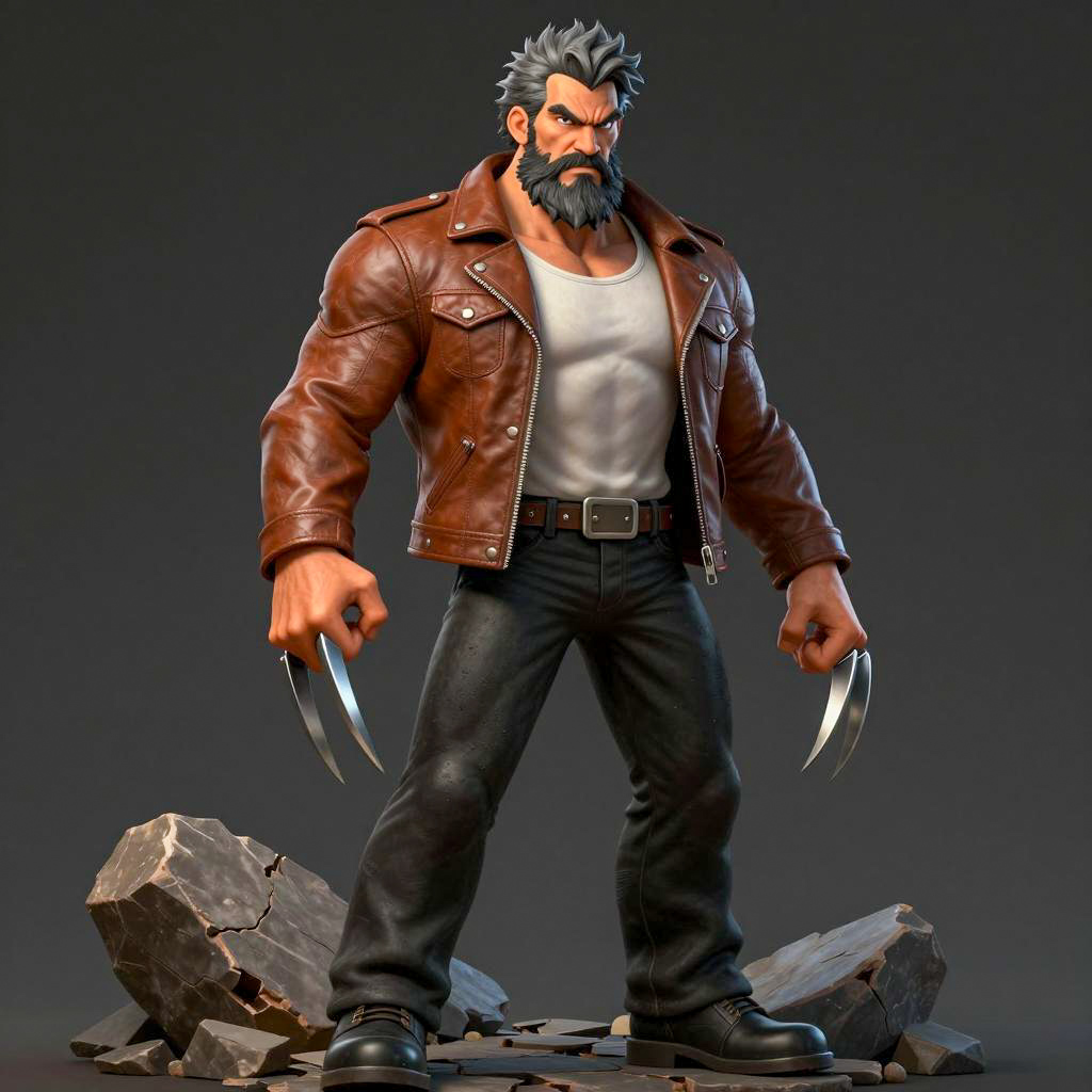Digital illustration of a grizzled middle-aged man with a black beard and gray hair, wearing a brown leather jacket over a white tank top and black pants. He has a muscular build and stands on broken rocks with an intense and angry expression. Each hand features three sharp metal claws. The man wears black shoes and poses with legs slightly apart and claws raised, set against a dark background.