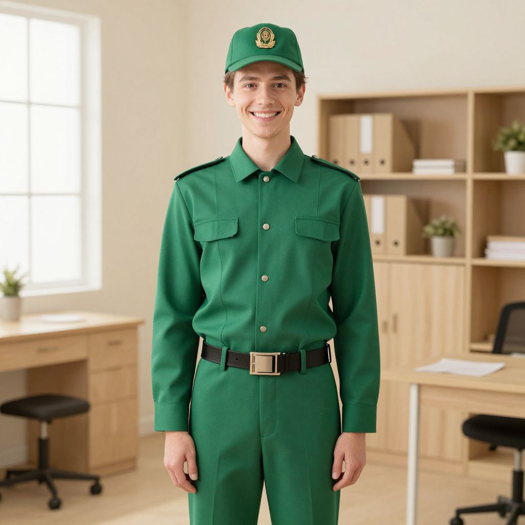 Photograph of a young man standing in a well-lit office. He is smiling and wearing a green military-style uniform with a matching green cap, adorned with a gold emblem. The uniform includes a buttoned shirt with two chest pockets and black belt with a square buckle. The office features light wooden shelves with books and potted plants, a desk with a computer, and a window with white blinds on the left. The flooring is light-colored wood, and there is an office chair partially visible on the left. The man has short brown hair and a fair complexion.