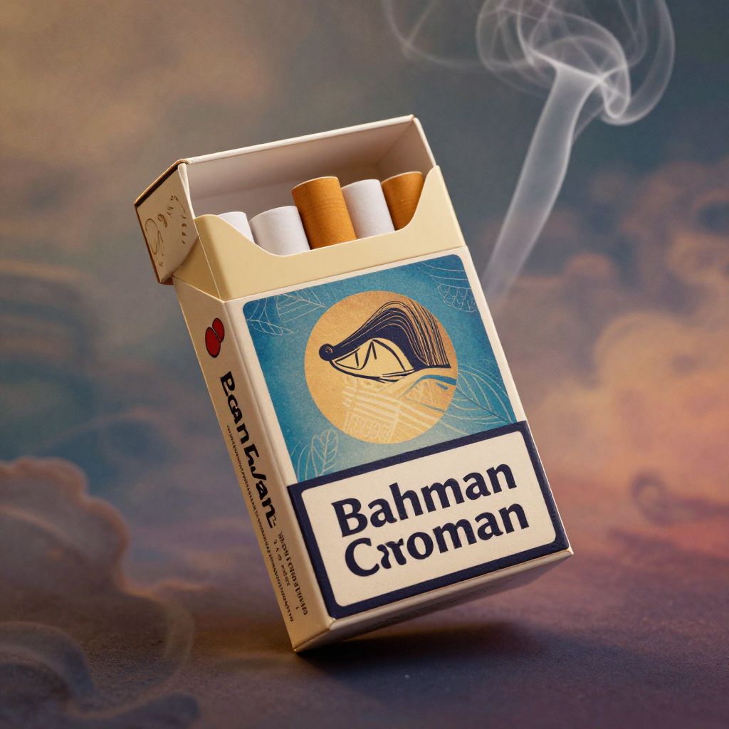 Bahman cigarettes vintage advertisement style, retro 1950s design, bold typography with elegant smoke curls, muted pastel colors, classic pack design, cinematic lighting