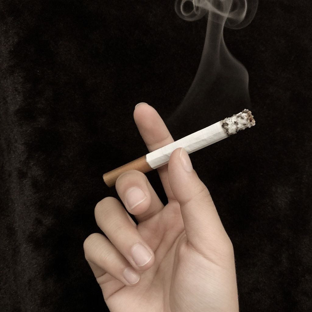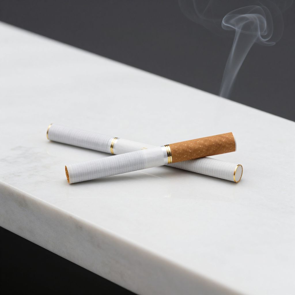 Photograph of a glowing Bahi Son ANC oban cigarette pack with smoke rising, set against a dark background and wooden surface.