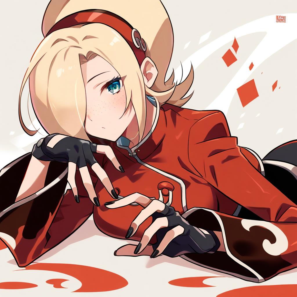 Ash crimson, the king of fighters, 1boy, blue eyes, hair over one eye, blonde hair, hairband, freckles, fingerless gloves, nail polish, black nails, by artist r-king, animagine