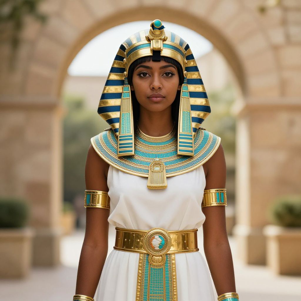This is a digital art image of a young woman with dark brown skin, wearing an ancient Egyptian-inspired outfit. She has an elaborate headpiece with gold and blue stripes, a matching collar, and a white dress with gold and turquoise accents. She's standing in front of a blurred stone archway with some greenery in the background. Her jewelry includes a golden belt, bracelets, and a necklace. She looks straight at the viewer with a calm expression.