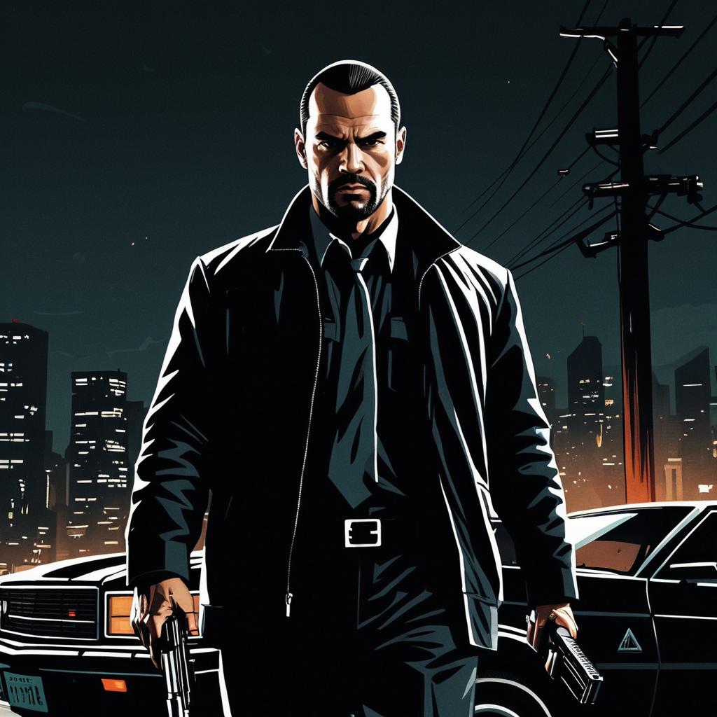 Realistic photo.Grand Theft Auto inspired illustration of a fearless hitman, with dark and moody tones.