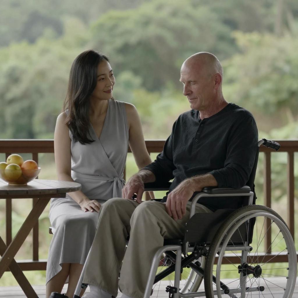 Photograph of an Asian woman with long black hair in a sleeveless, light gray wrap dress, sitting beside a bald, middle-aged Caucasian man in a black shirt, who is in a wheelchair. They are on a wooden balcony with a blurred green forest background. A table in front holds a bowl of fruit and a basket. The woman smiles gently at the man, who looks down.