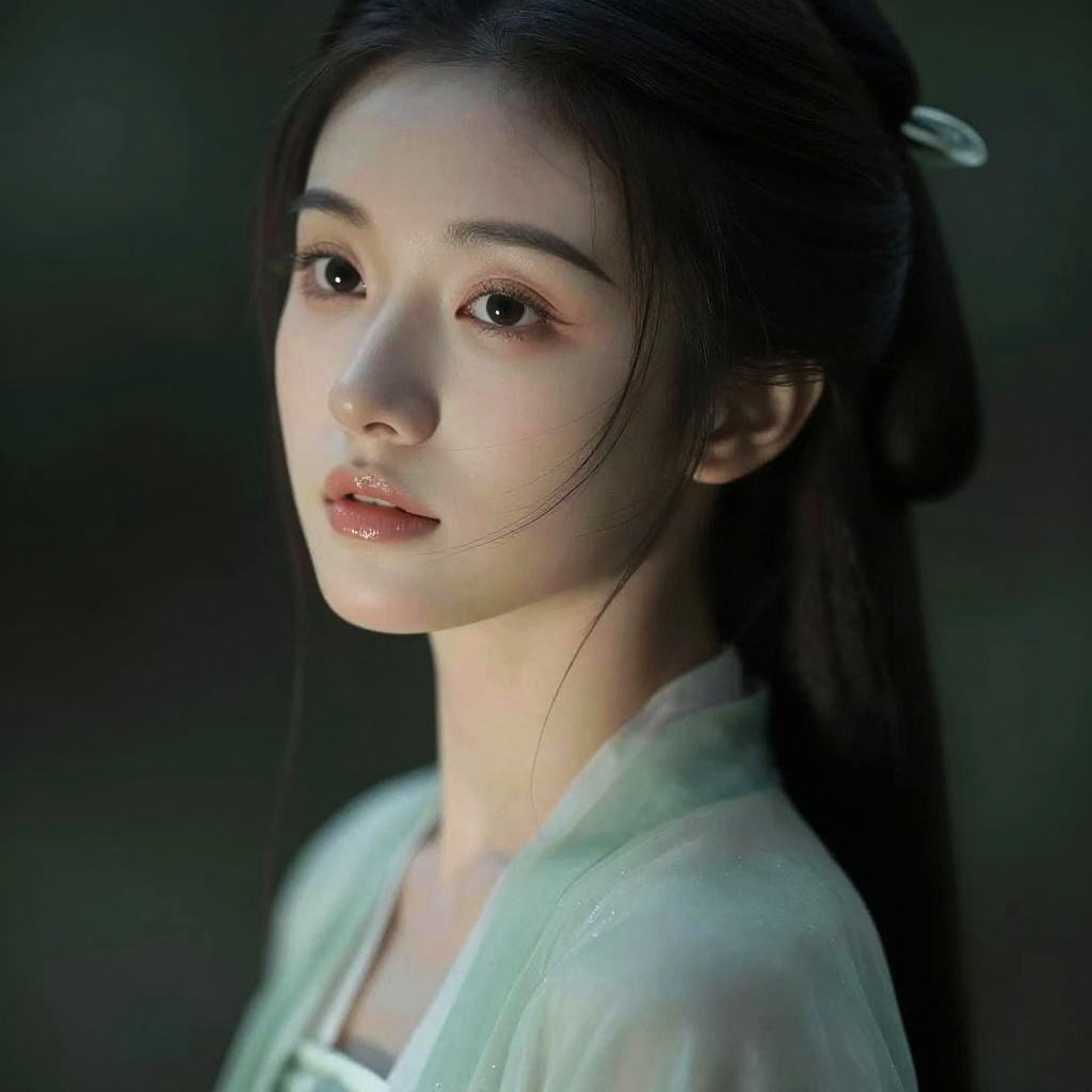 Jade like skin glowing softly under moonlight, ethereal beauty, smooth translucent texture, subtle green hues, serene expression, fantasy portrait, high detail, soft focus