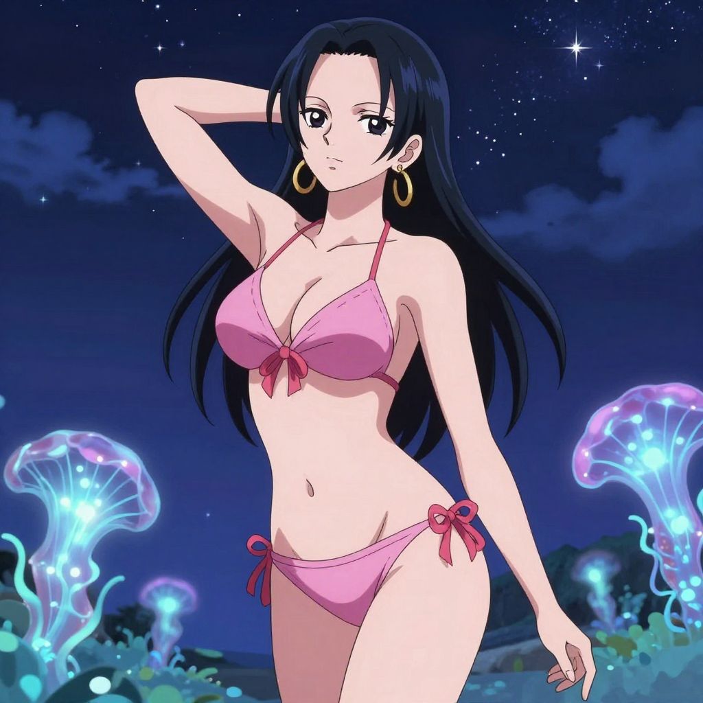 Boa Hancock in a bikini under a starry night sky, glowing bioluminescent plants around, serene and graceful, soft pastel colors, beautifully detailed anime illustration