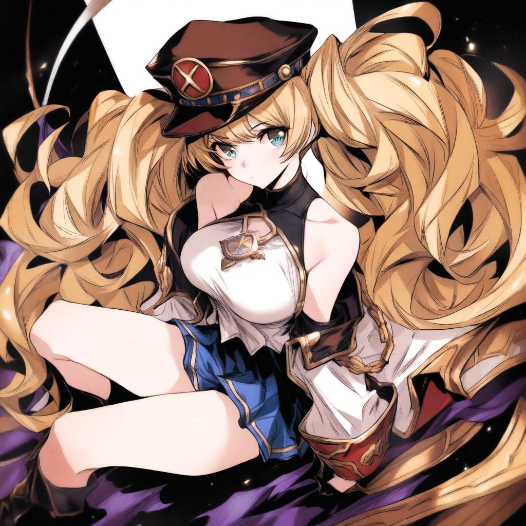 Monika weisswind, granblue fantasy, 1girl, brown eyes, green eyes, blonde hair, long hair, wavy hair, twintails, ahoge, large breasts, thighs, peaked cap, bare shoulders, by artist tima, animagine