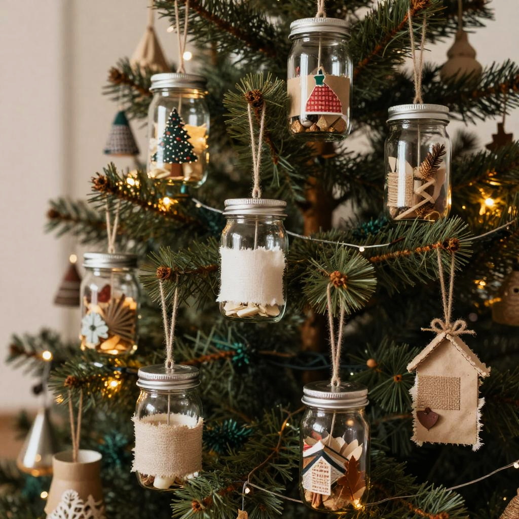 Christmas decorations from recycled materials hanging on a rustic wooden tree, eco-friendly ornaments made from paper, fabric scraps, and repurposed glass jars, warm festive lighting