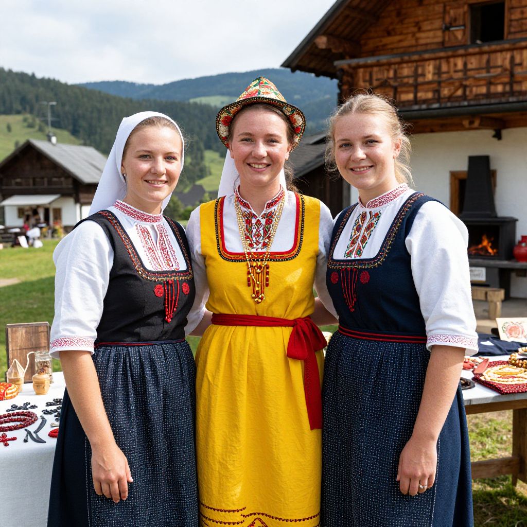 A group portrait of three women at a folk celebration in the Carpathian Mountains, one wearing a full Moravian folk costume: a bright yellow peasant dress, a red sash with golden beads, and a traditional hat with a floral pattern, all with natural, sun-kissed skin, warm eyes, and smiling faces amid wooden buildings, fireplaces, and local crafts laid on a table nearby.