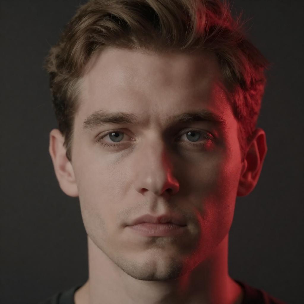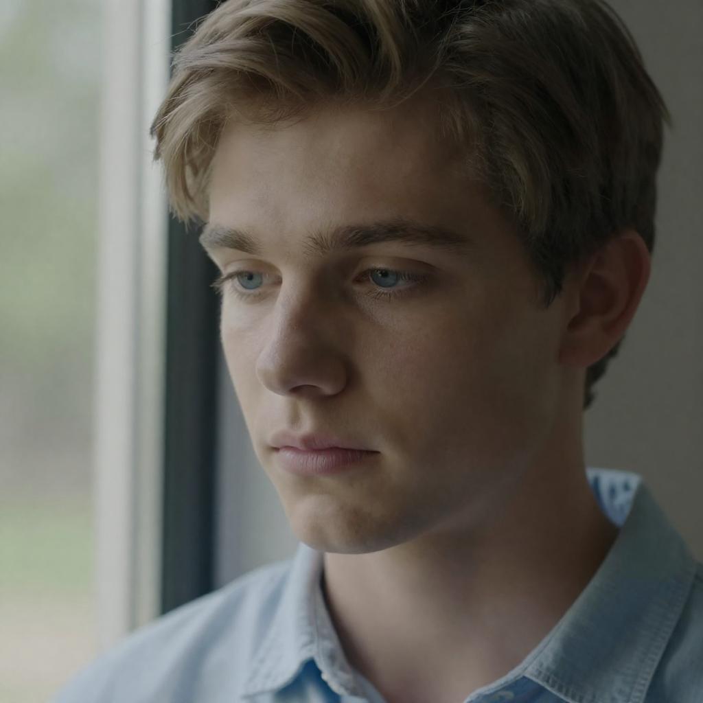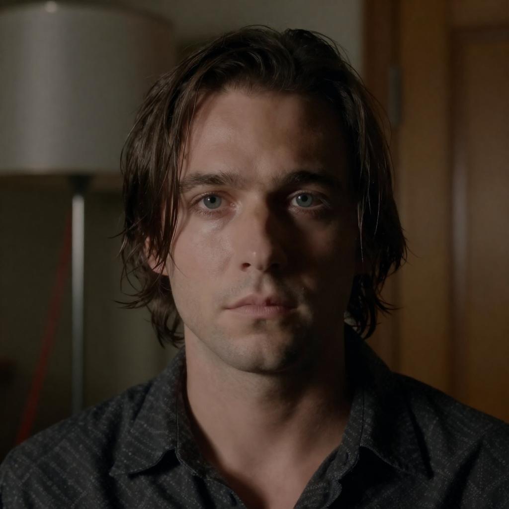 Close-up portrait of a young Caucasian man with intense green eyes and light brown hair. He has a serious expression and is holding his left hand near his face, wearing multiple silver rings. The background is softly blurred.