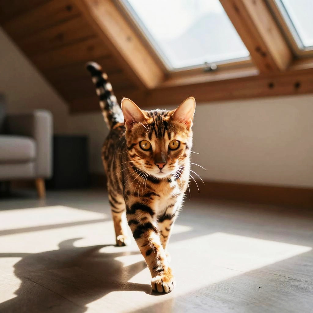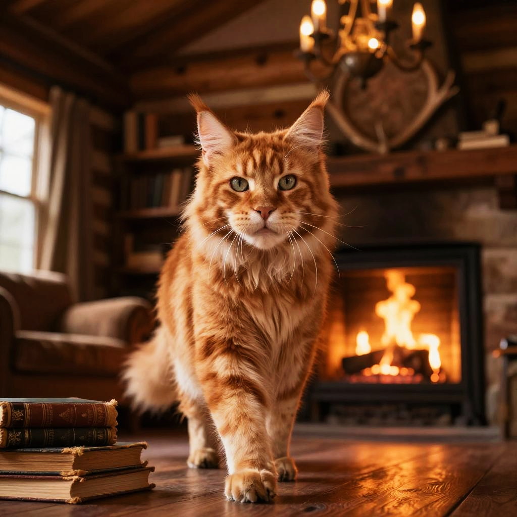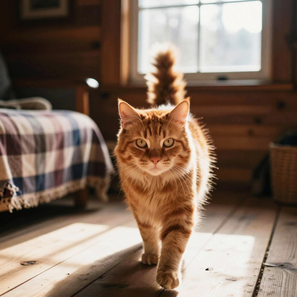 Fluffy orange tabby cat with pale yellow eyes confidently walking toward the viewer across rustic cabin living area with pine wood walls and checkered blankets, lit by warm natural daylight streaming through frosted windows. Natural textures of fur, fabric, and wood emphasized; inviting and homey atmosphere; shallow depth of field; crisp whiskers; soft vignetting; balanced composition; subtle film grain; realistic color rendering; gentle contrast; fine detail throughout.