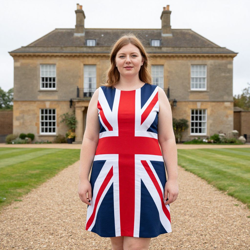 British Flag Dress Plus Size, woman in a union jack dress standing in front of a large house