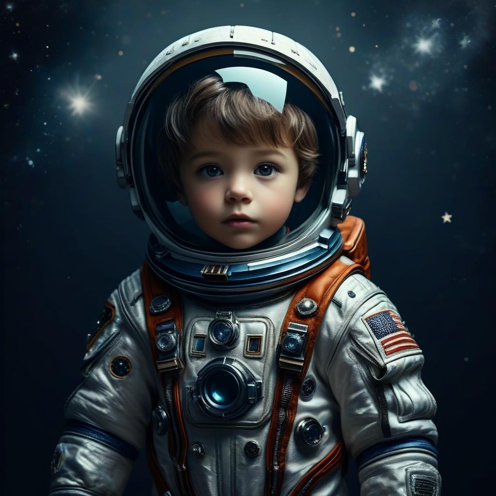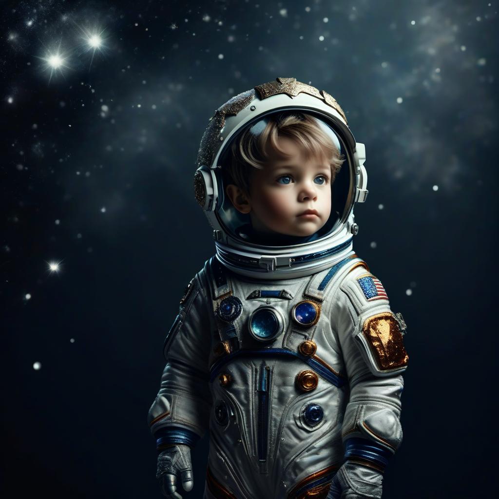(Masterpiece-1.5), RAW photo, film grain, (best quality-1.5), (photorealistic), realistic, real picture, intricate details, photo of full body a charming little boy in an astronaut costume, outer space background, diamond crown on head, (((dark background)))