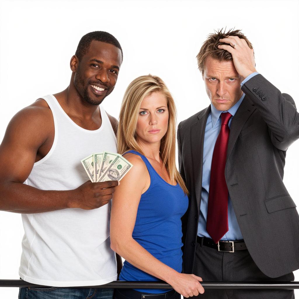 Photograph of three people. Muscular black man in white tank top, smiling, holding money, pointing. Handsome white man in blue suit, red tie, serious, hand on head. Blonde woman in blue dress, leaning on red car, neutral expression. Background white.
