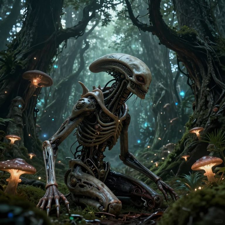 Imagine a surrealistic image that blends biomechanical elements with the natural world, reminiscent of H.R. Giger's unique vision. The scene depicts an eerie forest clearing, where ancient trees loom overhead and bioluminescent fungi cast an otherworldly glow. In the foreground, the creature's body is revealed through a fusion of organic and metallic materials, showcasing its intricate anatomy while hinting at hidden machinery beneath its surface. This unsettling yet captivating masterpiece evokes both horror and fascination as it merges nature with the enigmatic depths of extraterrestrial life, inviting viewers to explore its mysterious essence.