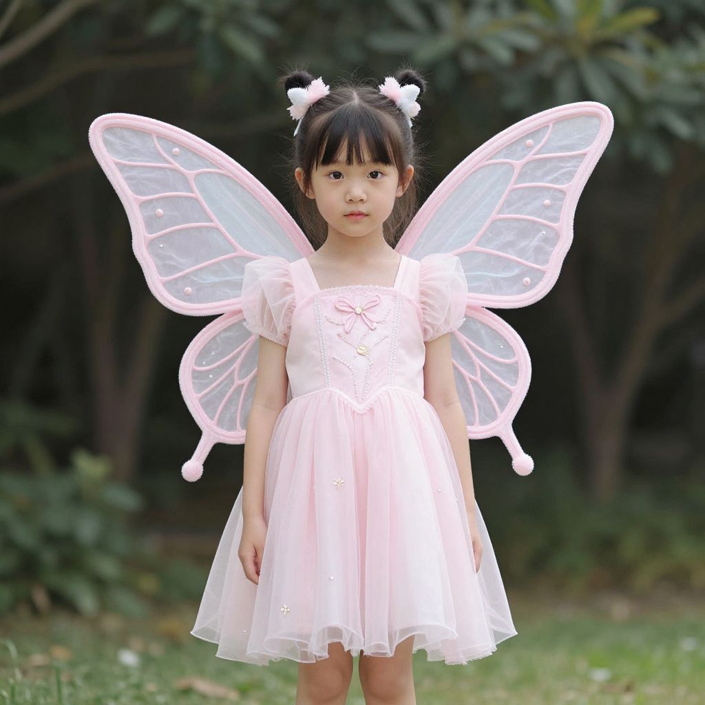 Slitty Fairy Costume, girl in a pink dress with a butterfly costume