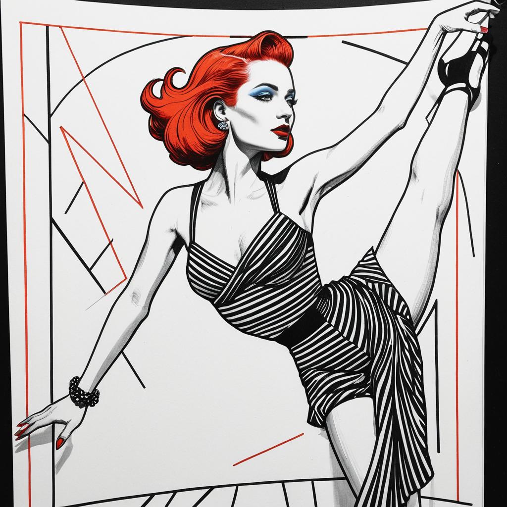 A sketched dragon at a quarter angle in comic style with pop art elements. Black and white with vibrant accents like pink lips, glinting eyes, and yellow hair, in the style of an outlined surrealist 1950s illustration. Art deco and minimalist influences, with a vintage yet colorful feel.