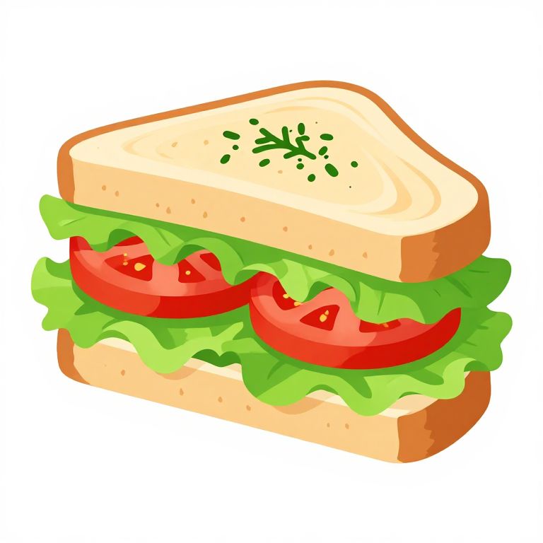 Digital illustration of a colorful sandwich with light brown bread, green lettuce, and two red tomato slices, garnished with green parsley.