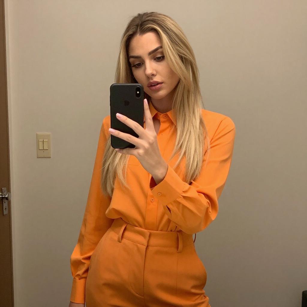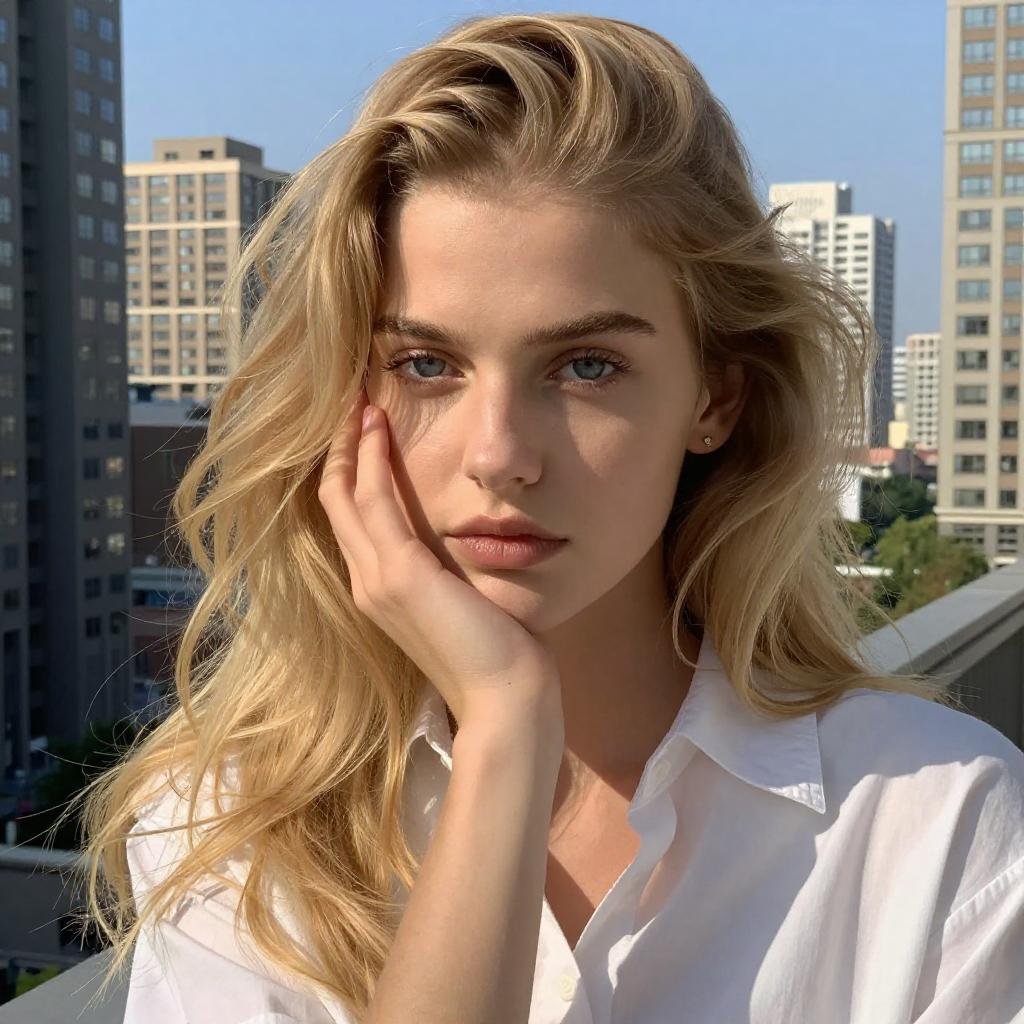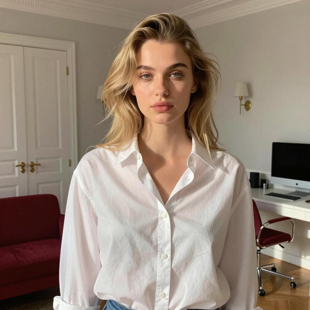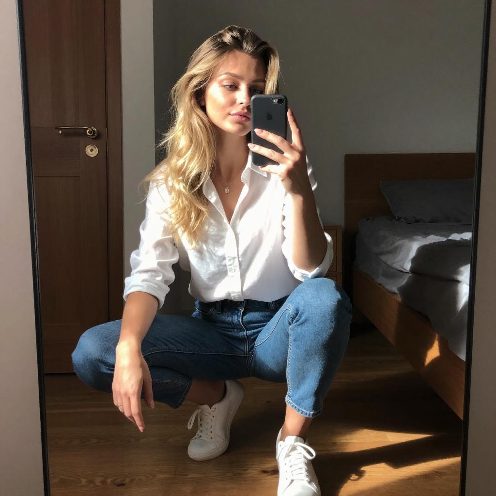 Photograph of a blonde woman with light skin, squatting in front of a mirror. She wears a white button-up shirt, blue jeans, and white sneakers. Sunlight highlights her face and hair, casting shadows in the dimly lit room. She holds a smartphone in her right hand, taking a mirror selfie. A wooden door and a bed with dark bedding are in the background.