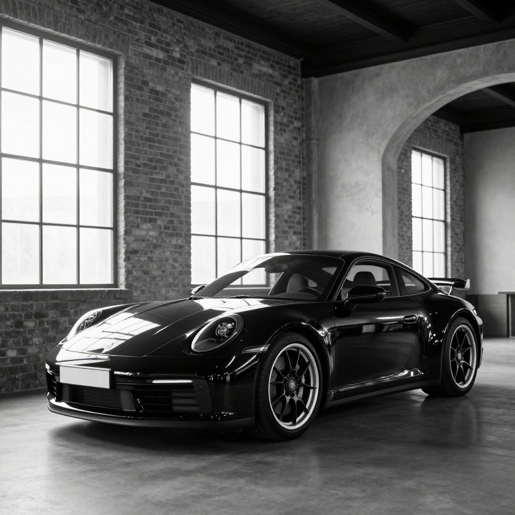 Photograph of a white classic Porsche sports car in a dimly lit garage. The car's front is prominently displayed, with round headlights shining brightly, a small Porsche emblem on the hood, and a white license plate reading "GLOCKEN." The car's sleek, chrome bumper and black side mirrors contrast with the dark background. To the right, a black Porsche with brown leather accents is partially visible, showcasing its vintage design and circular gauges. The garage has a simple, industrial feel with concrete floors and beige walls. The image highlights the elegance and timeless appeal of classic Porsche models.