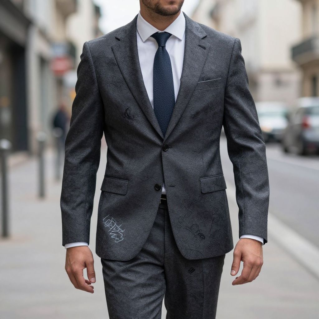 Street-inspired formal wear, European man, 30s, tailored suit with graffiti-inspired patterns, urban sophistication, realistic photography, soft natural lighting, city backdrop, modern twist on classic menswear