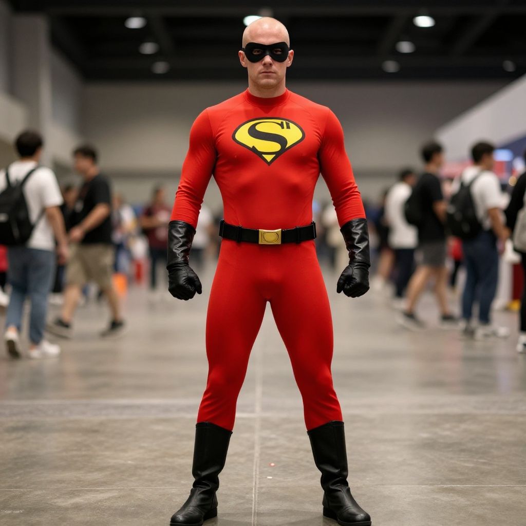 Photograph of a bald man in a red Superman suit with black gloves, boots, and mask, standing confidently in a blurred, crowded indoor convention hall