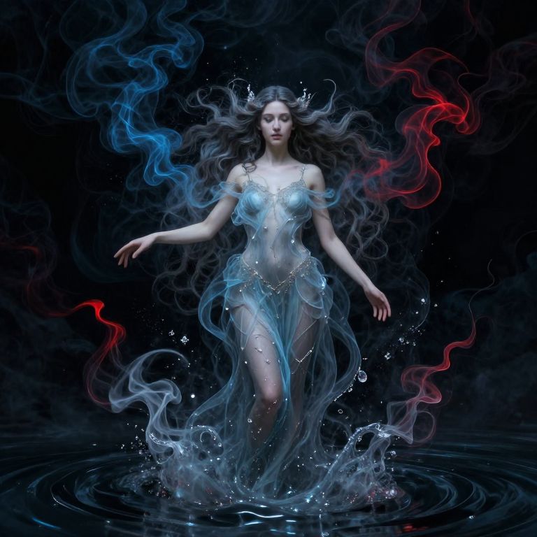 Photorealistic digital artwork of a fair-skinned, dark-haired woman with flowing hair, standing in a black, watery background. She wears a translucent, blue-tinged dress that appears wet, with water droplets splashing around her. Her arms are gracefully outstretched. Surrounding her are swirling, ethereal blue and red smoke-like wisps. She stands in a pool of water, creating ripples, with the dress clinging to her slender, curvaceous figure. The dark background contrasts with the vivid colors of the smoke and water, highlighting her serene, powerful presence.