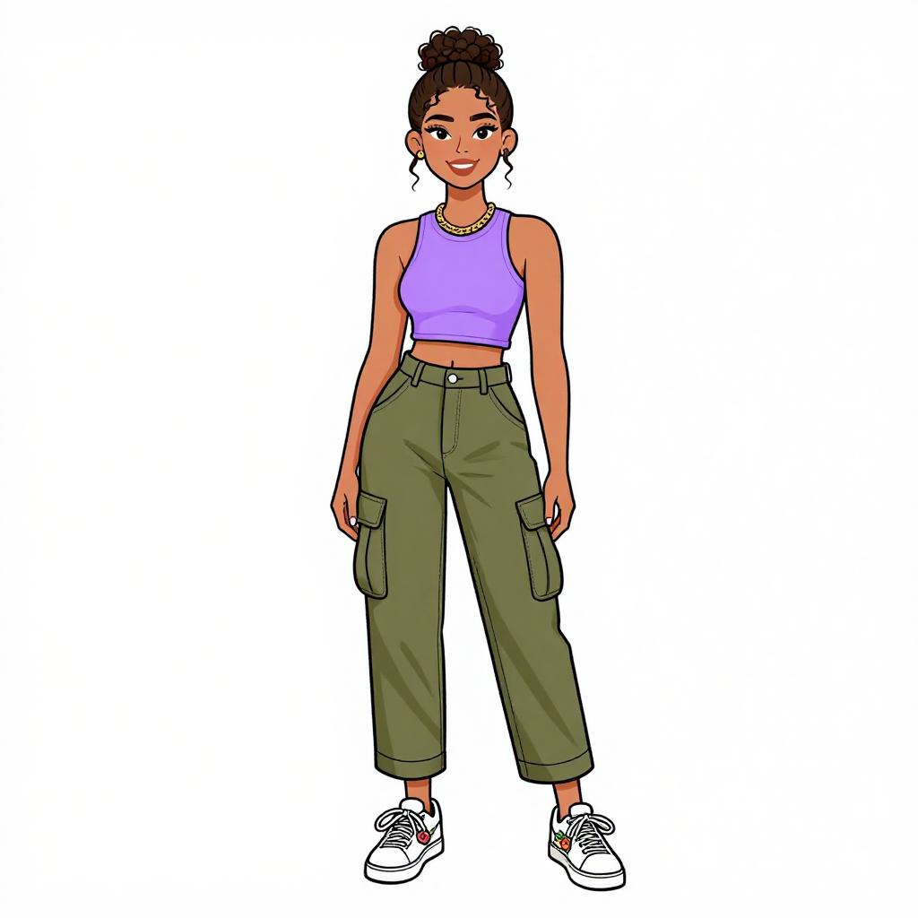 Illustration of a smiling woman with natural curly hair styled in an updo, wearing a sleeveless lilac crop top with a round neckline and high-waisted olive green cargo pants with a relaxed fit. She has white sneakers with floral embellishments and accessorizes with a gold chain necklace. The image is set against a plain white studio background.