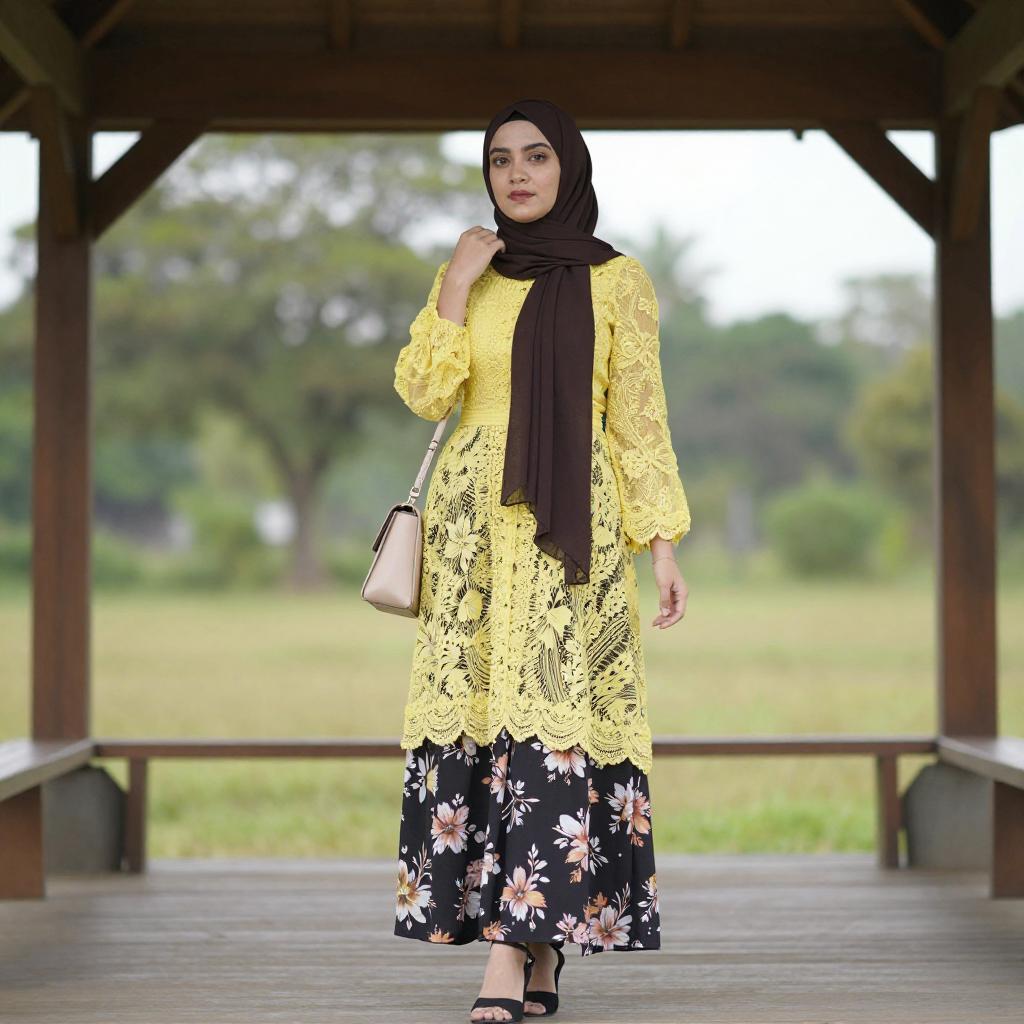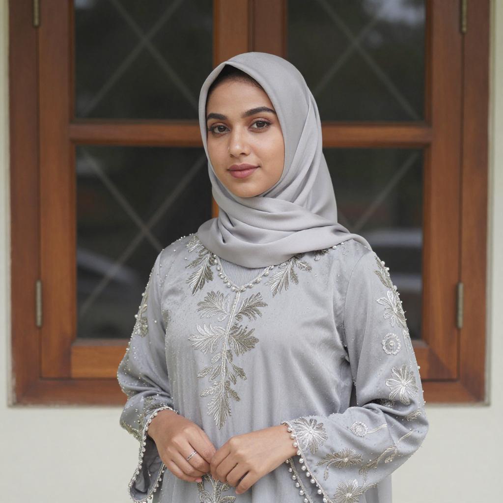 Photograph of a young woman with light skin and brown eyes, wearing a green hijab and matching long-sleeve dress with intricate embroidery. She sits on a wooden swing, holding the rope with her right hand, and has a white belt around her waist. The background is blurred with greenery and sunlight filtering through trees.